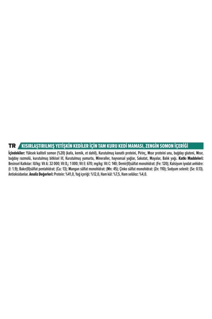 Pro plan sterilised somonlu kısırlaştırılmış kedi maması 3 kg purina pro plan tam kuru kedi maması ürün gamı, kedinizin hayır diyemeyeceği lezzet ve bilimsel uzmanlık ile formüle edilmiştir.; kedinizin öğünleri için seçtiğiniz lezzete göre yüksek kaliteli somon, hindi veya tavuk kuru mamalarımızın bir numaralı ana içeriğidir, yapay renklendirici ve yapay tatlandırıcı içermez.; kediniz purina pro plan ile besleyici ve dengeli bir öğünün tadını çıkarır! Kedinizin her yaştaki ihtiyaçlarını göz önünde bulundurarak geliştirdiğimiz formüllerimiz, kedinizin uzun ve sağlıklı bir yaşam sürmesine destek olur.; yavru kediler için pro plan kitten ile doğal bağışıklık sisteminin güçlendirilmesine destek olan tavuklu çeşidimiz, yetişkin kediler için pro plan adult ile temel yaşamsal duyularının desteklenmesine yardımcı olan somonlu ve tavuklu çeşitlerimizin yanı sıra kısırlaştırılmış kediler için pro plan sterilised ile sağlıklı böbreklerin desteklenmesine yardımcı olan somonlu ve hindi etli formülümüzü de tercih edebilirsiniz.; yavru, yetişkin, kısırlaştırılmış ve ileri yaştaki kedilerin ihtiyaçlarına özel geliştirilmiş lezzetler ile kedinize farklı tatlar sunuyoruz.; yavru kediler için gelişimlerini destekleyen pro plan original kitten tavuklu kedi maması, yetişkin kediler için bağışıklık sistemini ve böbrek sağlığını destekleyici pro plan original tavuklu veya somonlu, kısırlaştırılmış kediler için üriner sistem sağlığının sürdürülmesine yardımcı pro plan sterilised somonlu veya hindili çeşitleri arasından dilediğinizi seçebilir ve kedinize hem besleyici hem de lezzetli öğünler sunabilirsiniz.; içindekiler: Somon eti (%20), kurutulmuş kanatlı proteini, pirinç, mısır gluten unu, mısır, buğday gluten unu, buğday lifi, belüloz, kurutulmuş yumurta, mineraller, hayvansal yağ, sakatat, mayalar, balık yağı.